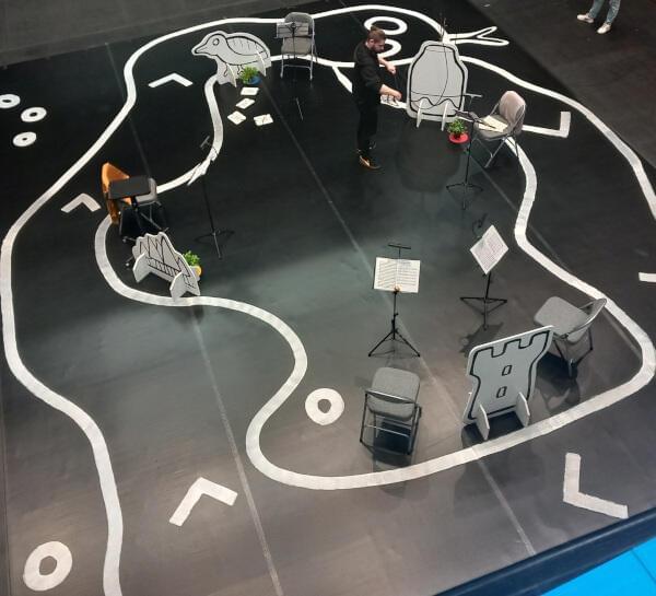 The art brief I received was to create a large snake art piece on the theatre floor, accompanied by vertical elements representing the adapted Enchanted Snake Story. To ensure transportability, I used large dance mats and anti-slip flexible paint to create a 10×8-meter immersive environment. To illuminate major features of the story, I made standing image constructions using MDF, primer, emulsion paint, and Molotow graffiti marker pens.